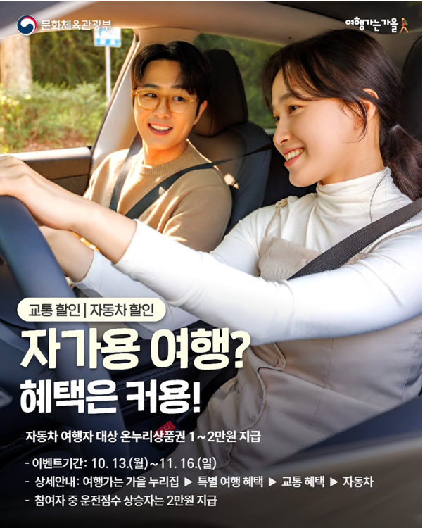 2025년 가을, 정부와 문화체육관광부가 함께 준비한 여행가는 가을 캠페인이 시작되었습니다. 🍂 이번 캠페인에서는 교통·숙박·여행상품 등 다양한 혜택이 제공되는데요, 특히 자가용 여행자를 위한 특별한 혜택이 마련되어 많은 관심을 받고 있습니다. 자동차로 여행을 떠나는 분들에게는 온누리상품권이 지급되며, 일정 조건을 만족할 경우 추가 보너스 혜택도 받을 수 있습니다. 이번 글에서는 2025 여행가는 가을 캠페인 자동차 혜택에 대해 알기 쉽게 정리해드리겠습니다.