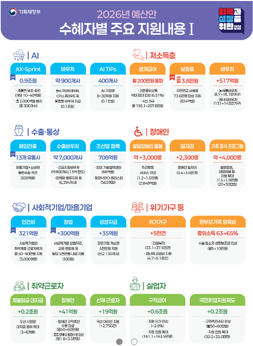 예산안은 통과 과정에서 일부 변동될 수 있으므로, 세부 기준·금액은 향후 각 부처 공고를 확인해 주세요.